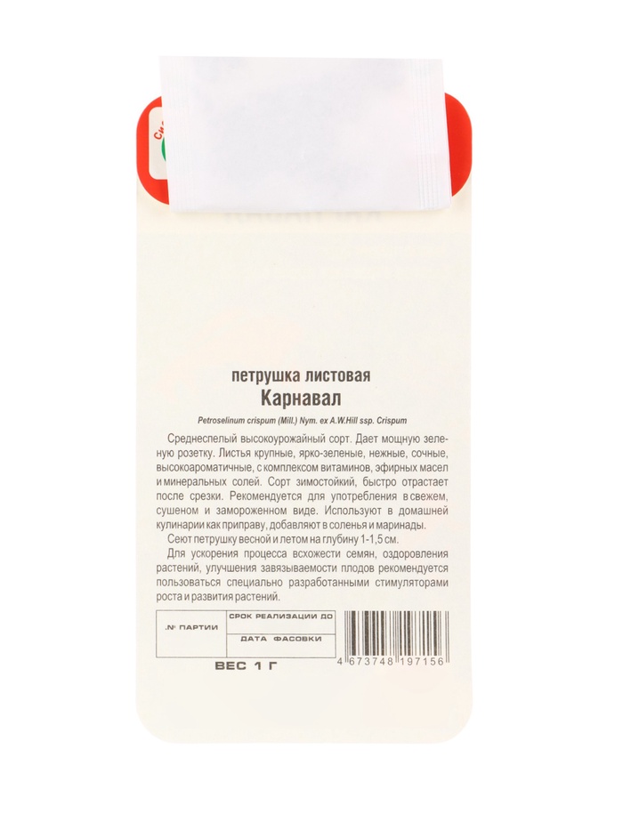 Среднеспелый листовой сорт (59-62 дней от всходов до уборки на зелень). Розетка крупная, высота 23-25 см, формируется до 20 листьев. Листья темно-зеленые, с крупными долями, очень ароматные, хорошо отрастают после срезки. Корневища перезимовывают в почве и быстро дают свежую зелень ранней весной. Рекомендуется для потребления в свежем, сушеном и консервированном виде. Уборку листьев производят периодически, по мере необходимости. Агротехника. Посев семян в открытый грунт на глубину 1-1,5 см. В фазе двух-трех настоящих листьев всходы прореживают. При выращивании на корнеплоды в период вегетации массовая срезка зелени не проводится. Для получения более раннего урожая возможен подзимний посев в конце октября – начале ноября. Растениям необходимы своевременные поливы, прополки, рыхления и подкормки.