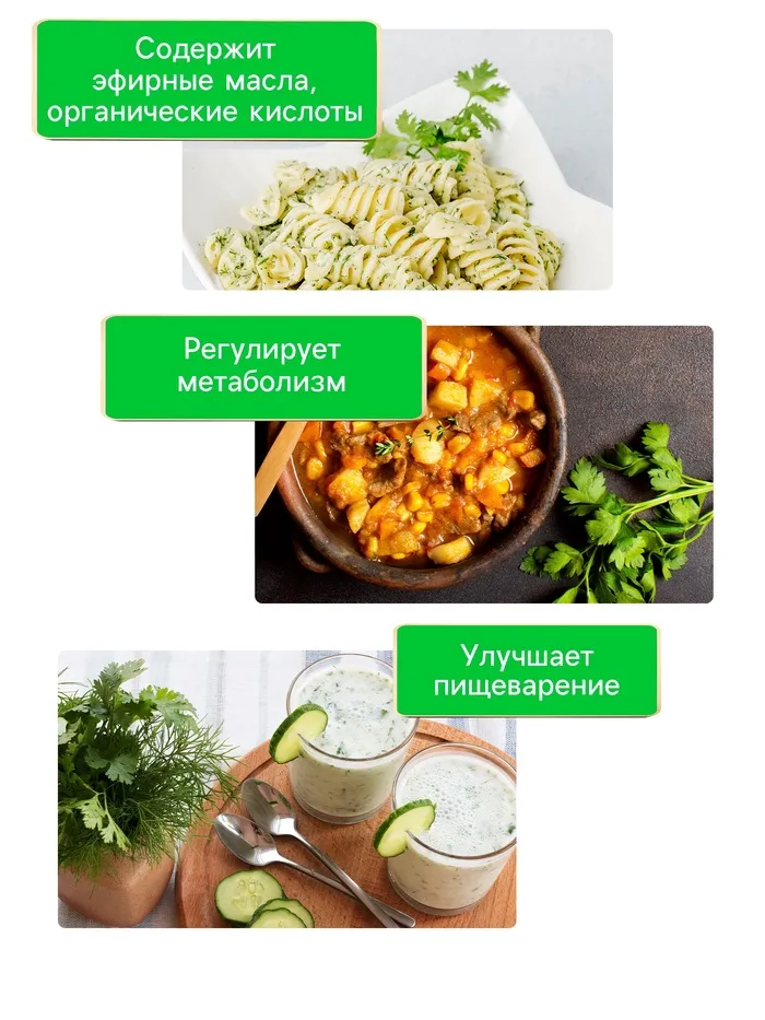 — Форма: Листья перистые и рассеченные, создают воздушный и легкий вид, идеально подходящий для украшения блюд.