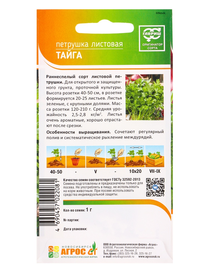 Семена Петрушка "Тайга" 1 г — Характеристики