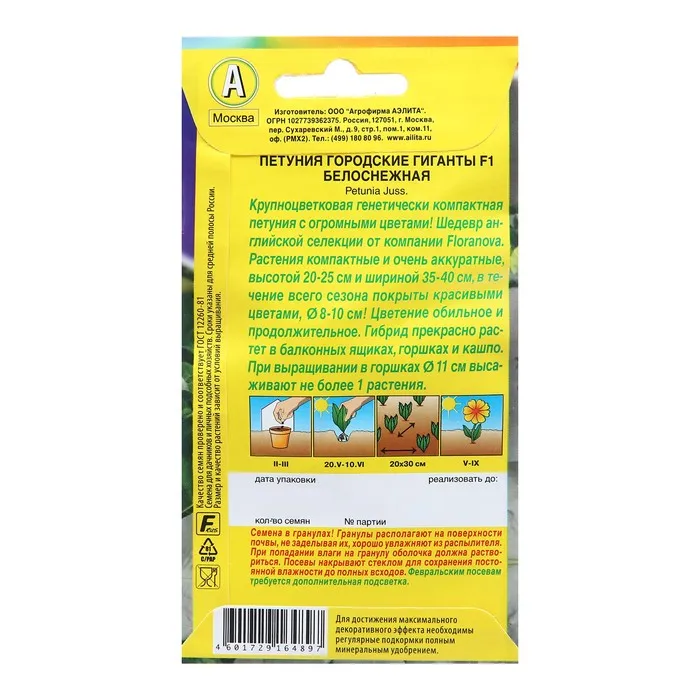 Семена Петуния Городские гиганты F1 белоснежная Одн (драже в пробирке) Ц/П 7шт — Характеристики