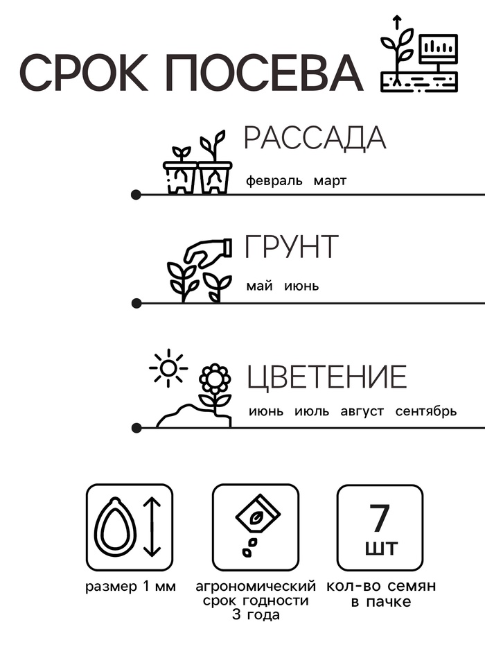 Ценная серия генетически низкорослых, обильно цветущих гибридов. Высота взрослых растений от 15 см (в горшках) до 25 см (ог). Применять регуляторы роста не нужно. Компактные кусты цветут парадоксально крупными для карликов цветками Ø 8-9 см и выглядят роскошными цветущими шарами. Декоративность серии не страдает в ненастную погоду. Кустики стабильно сохраняют привлекательный вид, не вытягиваются. Серия пригодна для воплощения любых дизайнерских проектов при оформлении цветников открытого грунта, балконов, патио, уличных контейнеров. Посев на рассаду с февраля до апреля. Семена в гранулах! Посев поверхностный, без заделки (семена прорастают на свету!), под стекло или пленку для сохранения постоянной влажности до полных всходов. Гранулы при посеве должны раствориться! Февральским посевам требуется дополнительная подсветка. Всходы появляются на 5-6 день. Пикировка в фазе 1-2-х настоящих листьев. Высадка в грунт закаленной рассады в конце мая.
