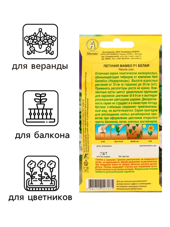 Семена Петуния «Мамбо» F1, белая многоцветковая, набор 5 шт., «Аэлита» — Характеристики