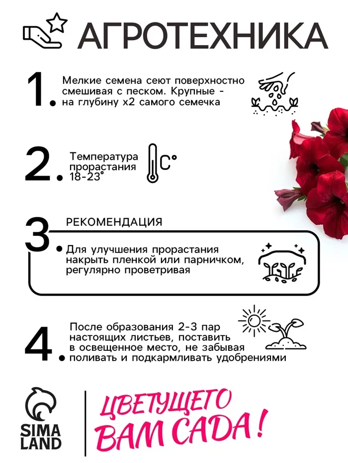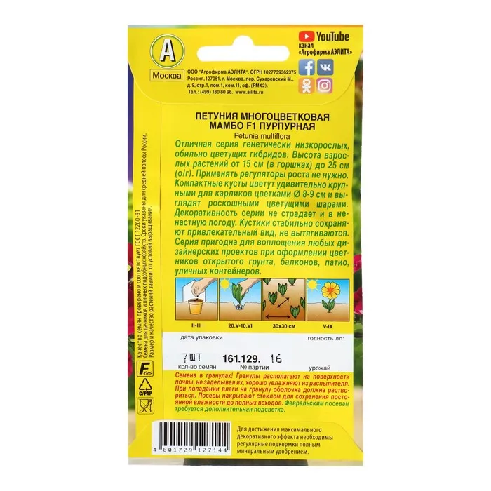Посев на рассаду с февраля до апреля. Семена в гранулах! Посев поверхностный, без заделки (семена прорастают на свету!), под стекло или пленку для сохранения постоянной влажности до полных всходов. Гранулы при посеве должны раствориться! Февральским посевам требуется дополнительная подсветка. Всходы появляются на 5-6 день. Пикировка в фазе 1-2-х настоящих листьев. Высадка в грунт закаленной рассады в конце мая.