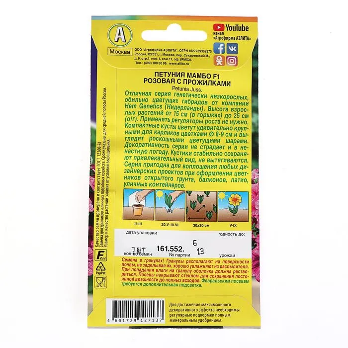 Посев на рассаду с февраля до апреля. Семена в гранулах! Посев поверхностный, без заделки (семена прорастают на свету!), под стекло или пленку для сохранения постоянной влажности до полных всходов. Гранулы при посеве должны раствориться! Февральским посевам требуется дополнительная подсветка. Всходы появляются на 5-6 день. Пикировка в фазе 1-2-х настоящих листьев. Высадка в грунт закаленной рассады в конце мая.