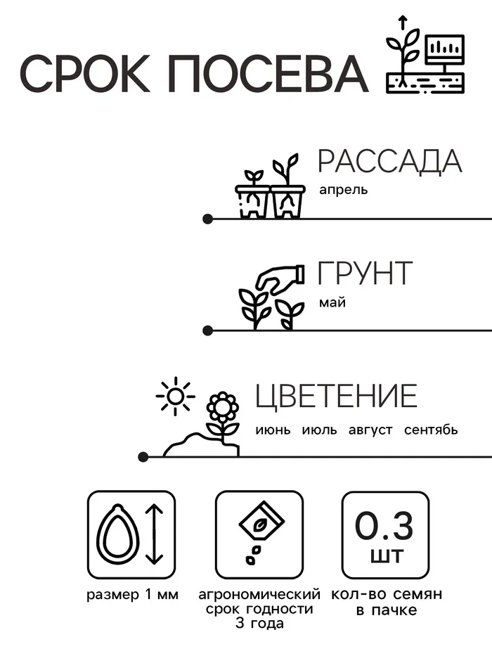 Посев на рассаду с февраля до апреля. Семена в гранулах! Посев поверхностный, без заделки (семена прорастают на свету!), под стекло или пленку для сохранения постоянной влажности до полных всходов. Гранулы при посеве должны раствориться! Февральским посевам требуется дополнительная подсветка. Всходы появляются на 5-6 день. Пикировка в фазе 1-2-х настоящих листьев. Высадка в грунт закаленной рассады в конце мая.