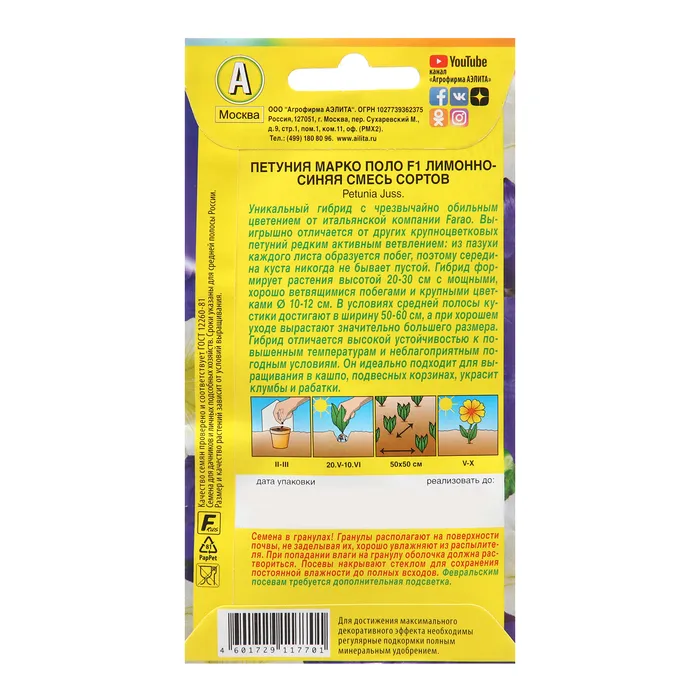 Семена Петуния "Марко Поло" F1 лимонно-синяя, смесь окрасок, 10 шт — Характеристики
