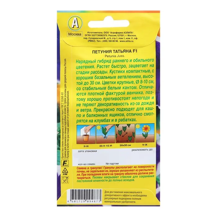 Семена Петуния Татьяна F1 крупноцветковая Одн (драже в пробирке) Ц/П 7 шт — Характеристики