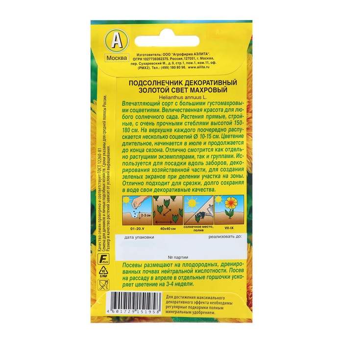Семена Подсолнечник декоративный махровый «Золотой свет», однолетник, 0.5 г, «Агрофирма АЭЛИТА» — Характеристики