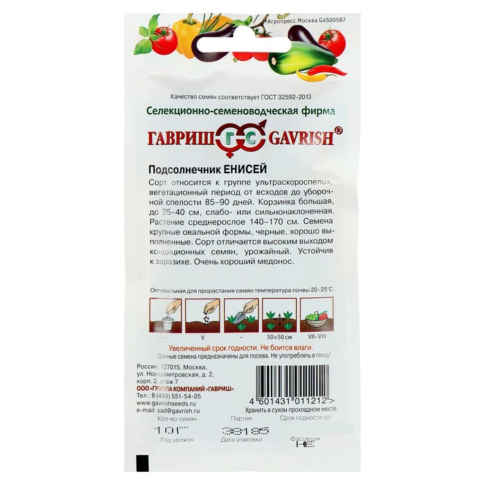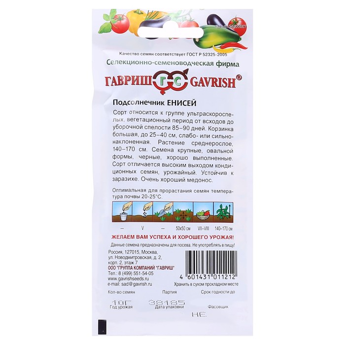 «Енисей» — ультраскороспелый урожайный сорт, у которого период от проростков до уборочной зрелости составляет 85–90 дней. Отличается высоким выходом кондиционных семян. Устойчив к заразихе. Среднерослый сеянец достигает 140–170 см в высоту. Образует большую слабо- или сильнонаклонённую корзинку. Чёрные крупные семена имеют овальную форму. Является хорошим медоносом.
