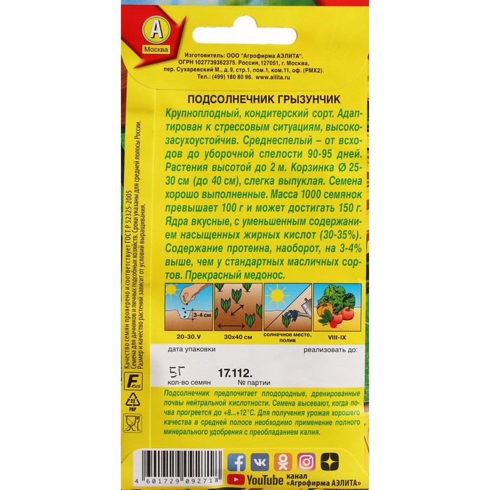 Подсолнечник– теплолюбивая культура, посев в открытый грунт проводят в третьей декаде мая, когда почва прогреется до 10-12°С, на глубину 2-3 см. Подсолнечник требует плодородных, дренированных, нейтральных по кислотности почв и солнечного местоположения. Растениям необходимы своевременные поливы, прополки, рыхления и подкормки.