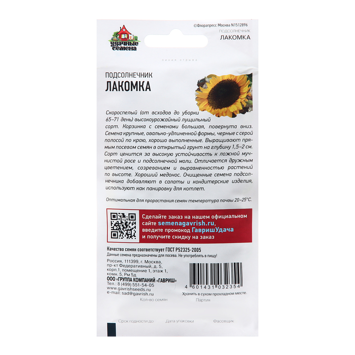 Раннеспелый (период от всходов до уборочной спелости 90-95 дней) сорт кондитерского направления использования. Растение высокорослое, 1,5-1,7 м, без ветвления. Корзинка большая, плоская. Семена крупные, овально-удлиненные, черные, ровные. Ценность сорта: устойчивость к мучнистой росе, выравненность растений по высоте, дружность цветения, хорошая созреваемость и отличное качество семян, высокое содержание жира и белка. Является медоносом. Семена используются в свежем и жареном виде, добавление соли может улучшить вкус.