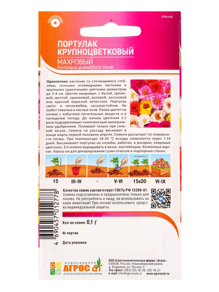 Семена Портулак крупноцветковый, махровый, 0.1 г, «Агросс» — Характеристики