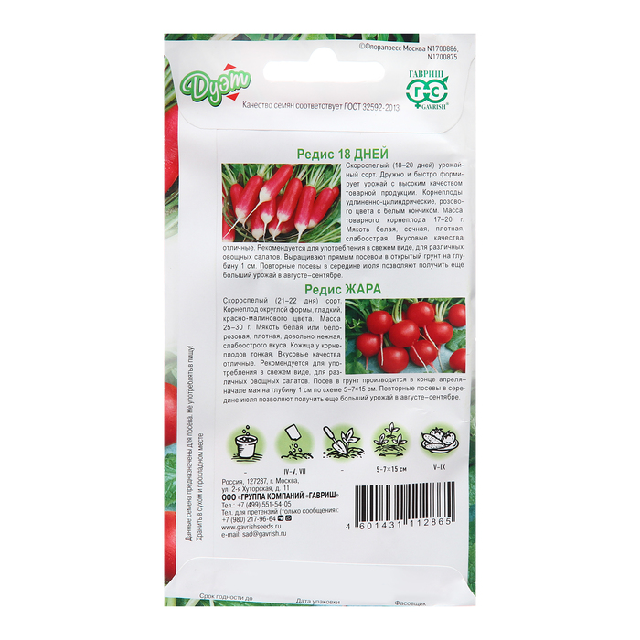 Скороспелый (18-20 дней) урожайный сорт. Дружно и быстро формирует урожай с высоким качеством товарной продукции. Корнеплоды удлиненно-цилиндрические розового цвета с белым кончиком. Масса товарного корнеплода 17 г. Мякоть белая, сочная, плотная, слабоострая. Вкусовые качества отличные. Рекомендуется для употребления в свежем виде и различных овощных салатов. Выращивают прямым посевом в открытый грунт на глубину 1 см. Повторные посевы в середине июля позволяют получить еще больший урожай в августе-сентябре.