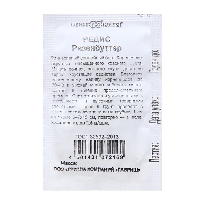 Очень ранний (22-24 дня от всходов до образования корнеплодов) сорт для всесезонного выращивания в открытом и защищенном грунте. Формирует крупные (до 21 г), ярко - красные, эллиптической формы корнеплоды с белой, сочной, мякотью. Вкус слабоострый. Ценность сорта: слабая чувствительность к длине светового дня, урожайность, устойчивость к стрелкованию. Долго сохраняет товарный вид. Подходит для выращивания на пучковую продукцию.Посев: в открытый грунт - в конце апреля - начале мая, затем -в конце июля. Глубина посева 1,5 см. Схема размещения растений 5х10 см. Лучшие почвы - рыхлые, плодородные, супесчаные и суглинистые, с нейтральной реакцией. Оптимальная температура для развития корнеплодов 16-20° С.Уход: рыхление междурядий, регулярные поливы, защита от крестоцветной блошки. Обязательно соблюдение севооборота (нельзя сеять после крестоцветных культур).Сбор урожая: по мере формирования корнеплодов, не допуская передержки в почве.
