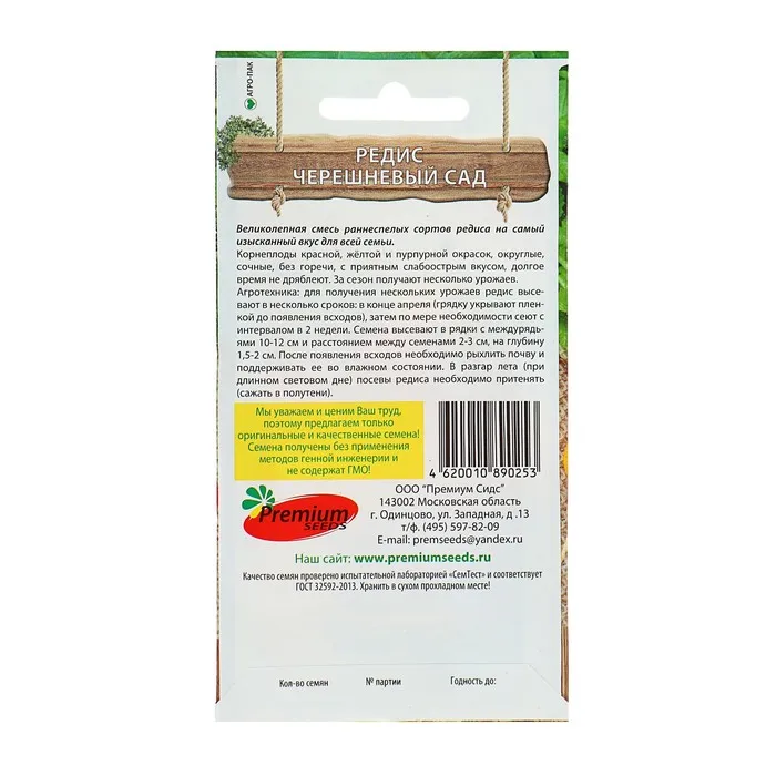 Агротехника: для получения нескольких урожаев редис высевают в несколько сроков: в конце апреля (грядку укрывают пленкой до появления всходов), затем по мере необходимости сеют с интервалом в 2 недели. Семена высевают в рядки с междурядьями 10-12 см и расстоянием между семенами 2-3 см, на глубину 1,5-2 см. После появления всходов необходимо рыхлить почву и поддерживать ее во влажном состоянии. В разгар лета (при длинном световом дне) посевы редиса необходимо притенять (сажать в полутени).