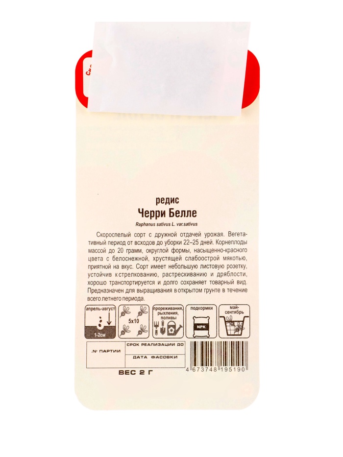 Скороспелый сорт с дружной отдачей урожая. Вегетативный период от всходов до уборки 22-25 дней. Корнеплоды массой до 20грамм, округлой формы, насыщенно-красного цвета с белоснежной, хрустящей слабоострой мякотью, приятной на вкус. Сорт имеет небольшую листовую розетку, устойчив к стрелкованию, растрескиванию и дряблости, хорошо транспортируется и долго сохраняет товарный вид. Предназначен для выращивания в открытом грунте в течение всего летнего периода