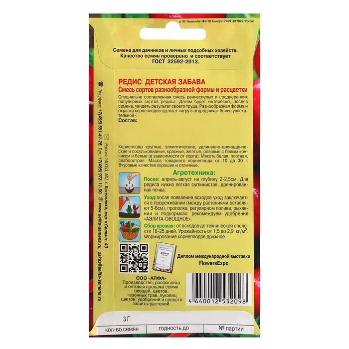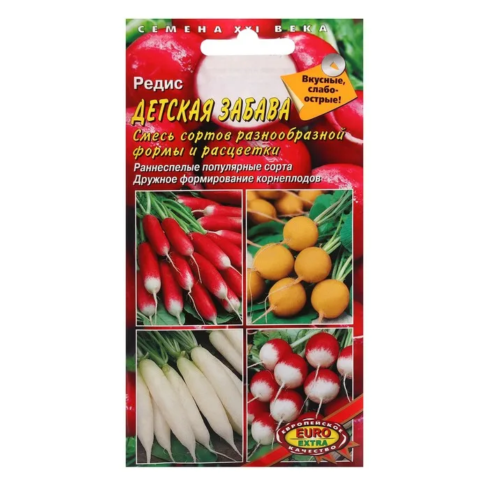Специально составленная смесь раннеспелых и среднеранних популярных сортов редиса. Детям будет интересно, посеяв семена, увидеть результат своего труда. Разнообразная форма и окраска корнеплодов сделает «игру в огородника» более увлекательной.