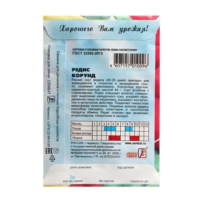 Раннеспелый сорт европейской селекции с дружным формированием урожая. Период от всходов до технической спелости 25-30 дней. Розетка листьев прямостоячая. Корнеплод округлый, красный, с белой, сочной, хрустящей и нежной мякотью отличного сладковатого вкуса, массой около 20г. Этот сорт редиса отличается способностью формировать урожай даже в условиях повышенных температур (легко переносит жару) и тем, что корнеплоды совсем не растрескиваются.