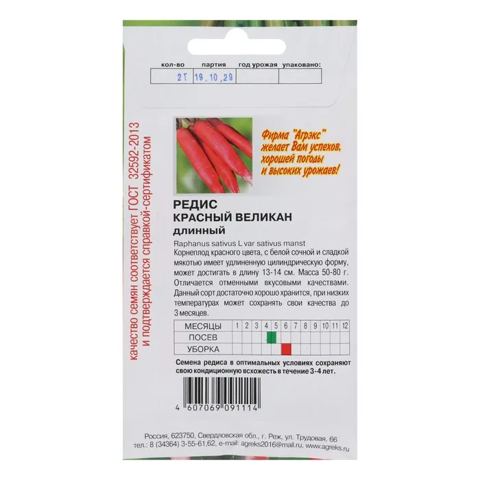 Позднеспелый (40-50 дня от всходов до технической спелости) сорт. Корнеплод красный с бело-розовой поперечной бороздчатостью, длинно-цилиндрический, длиной 12-13 см, диаметром 2,5-3,5 см, массой до 300 г.