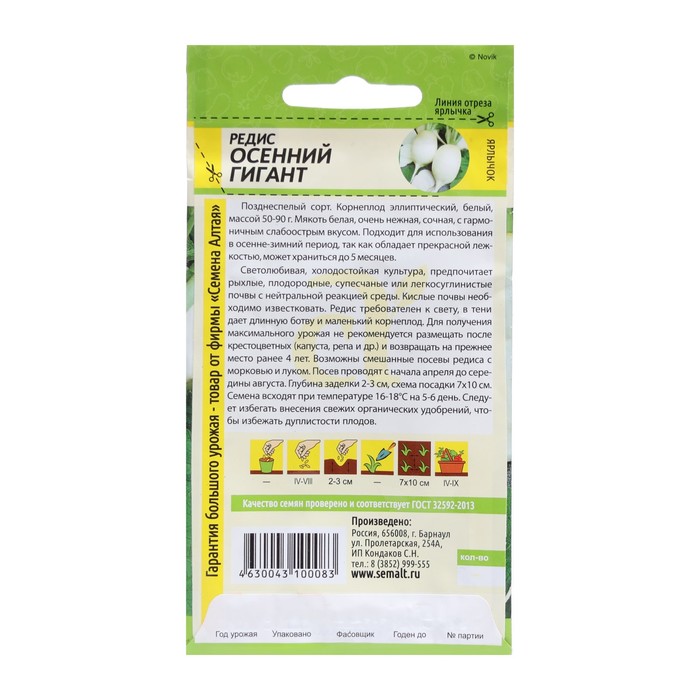 Позднеспелый сорт. Корнеплод эллиптический, белый, массой 50-90 г. Мякоть белая, очень нежная, сочная, с гармоничным слабоострым вкусом. Подходит для использования в осенне-зимний период, так как обладает прекрасной лежкостью, может храниться до 5 месяцев. Светолюбивая, холодостойкая культура, предпочитает рыхлые, плодородные, супесчаные или легкосуглинистые почвы с нейтральной реакцией среды. Кислые почвы необходимо известковать. Редис требователен к свету, в тени дает длинную ботву и маленький корнеплод. Для получения максимального урожая не рекомендуется размещать после крестоцветных (капуста, репа и др.) и возвращать на прежнее место ранее 4 лет. Возможны смешанные посевы редиса с морковью и луком. Посев проводят с начала апреля до середины августа. Глубина заделки 2-3 см, схема посадки 7х10 см. Семена всходят при температуре 16-18°C на 5-6 день. Следует избегать внесения свежих органических удобрений, чтобы избежать дуплистости плодов.