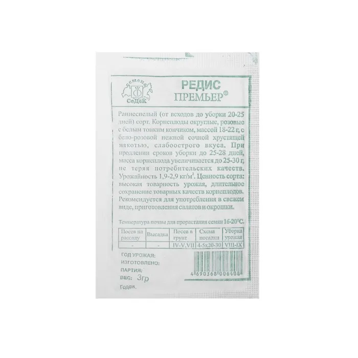 Раннеспелый (от всходов до уборки 20-25 дней) сорт. Корнеплоды округлые, розовые с белым тонким кончиком, массой 18-22 г, с бело-розовой нежной сочной хрустящей мякотью, слабоострого вкуса. При продлении сроков уборки до 25-28 дней, масса корнеплода увеличивается до 25-30 г, не теряя потребительских качеств. Урожайность 1,9-2,9 кг/м².