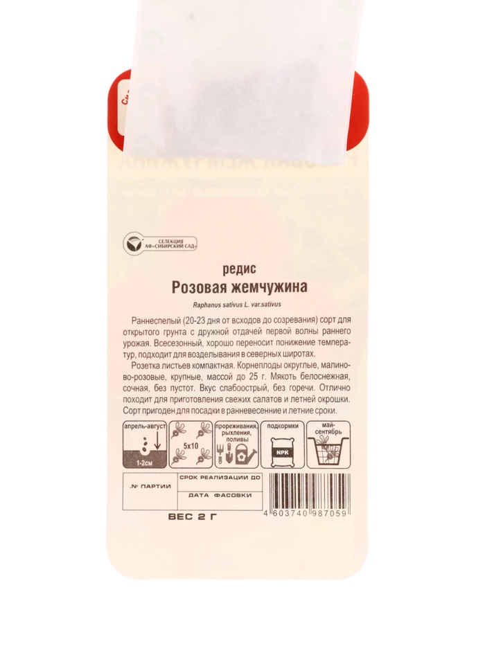 Раннеспелый (20-23 дня от всходов до созревания) сорт для открытого грунта с дружной отдачей первой волны раннего урожая. Всесезонный, хорошо переносит понижение температур, подходит для возделывания в северных широтах. Розетка листьев компактная. Корнеплоды округлые, малиново-розовые, крупные, массой до 25г. Мякоть белоснежная, сочная, без пустот. Вкус слабоострый, без горечи. Отлично походит для приготовления свежих салатов и летней окрошки. Сорт пригоден для посадки в ранневесенние и летние сроки.