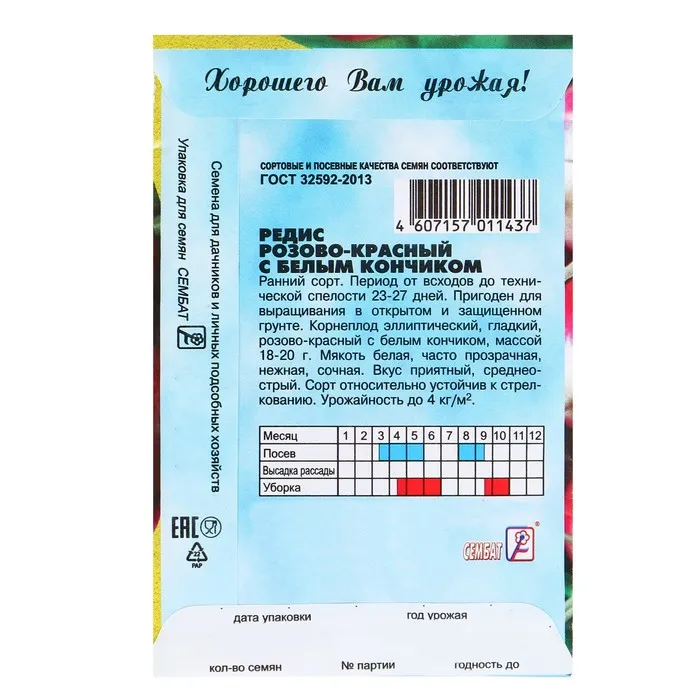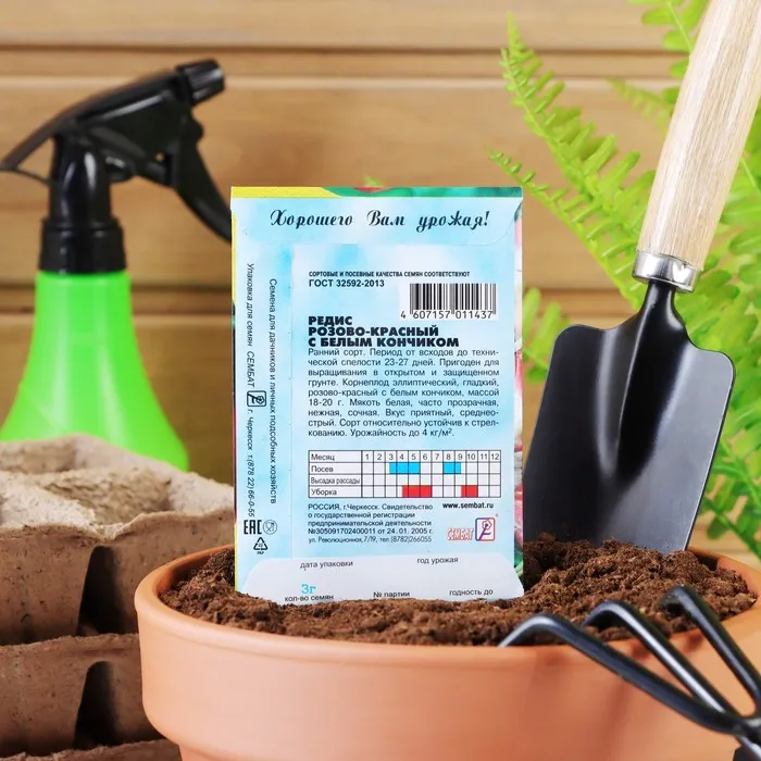 Подходит для открытого и для защищенного грунта. Посев проводят в течение всего сезона, начиная с ранней весны и до августа. Посев производят при прогревании почвы до 8-10°С на глубину 1,5 см. Культура холодостойка, выдерживает легкие заморозки. Хорошо растет на любой не слишком тяжелой почве. Наилучшего качества корнеплоды получают на освещенных и достаточно влажных участках. Растения нуждаются в своевременном поливе. Норма составляет каждые 2–3 дня. Если погода жаркая, то поливать редис рекомендуется ежедневно.