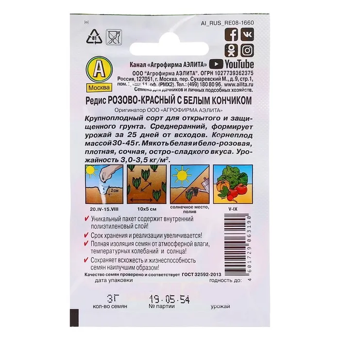 Семена Редис "Розово-красный" с б/к "Лидер", 2 г , — Характеристики