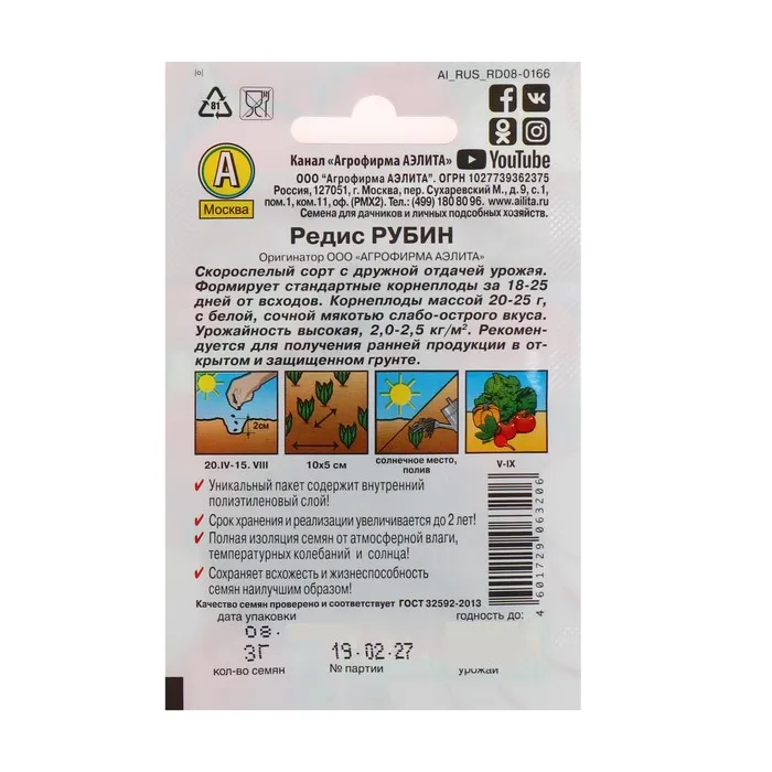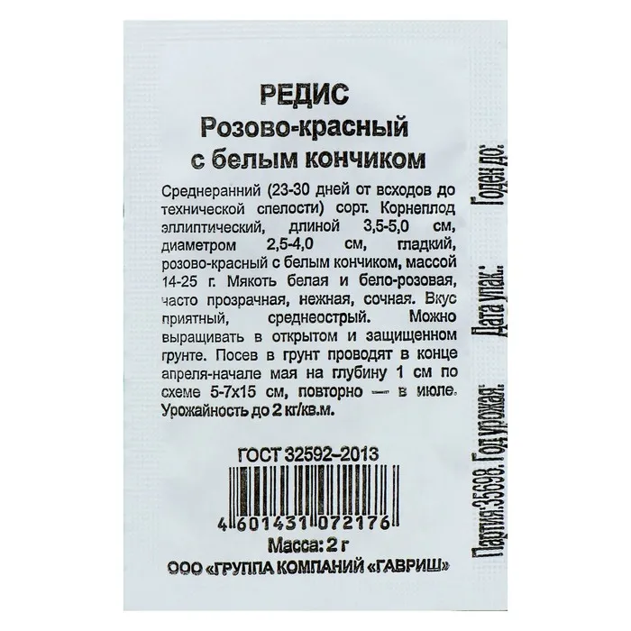 Семена Редис "Рубин" "Лидер", 3 г , — Характеристики