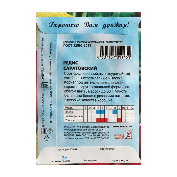 Сорт предназначен для выращивания в открытом грунте. Посев проводят в конце апреля – начале мая на глубину 1-1,5 см, с расстоянием в ряду 5 см, междурядий 10см. Под выращивание редиса отводят рыхлые, плодородные, супесчаные или легкодоступные почвы. На бедных, тяжелых и кислых почвах хороший урожай высокого качества не вырастает. Редис требователен к свету, в тени дает длинную ботву и маленьких корнеплод. Для получения максимального урожая редиса необходимо строгое соблюдение севооборота - не сажать его после крестоцветных. Возможны смешанные посевы редиса с морковью и луком. Посев проводят с начала апреля до середины августа. Семена всходят при температуре - 16-18 С.