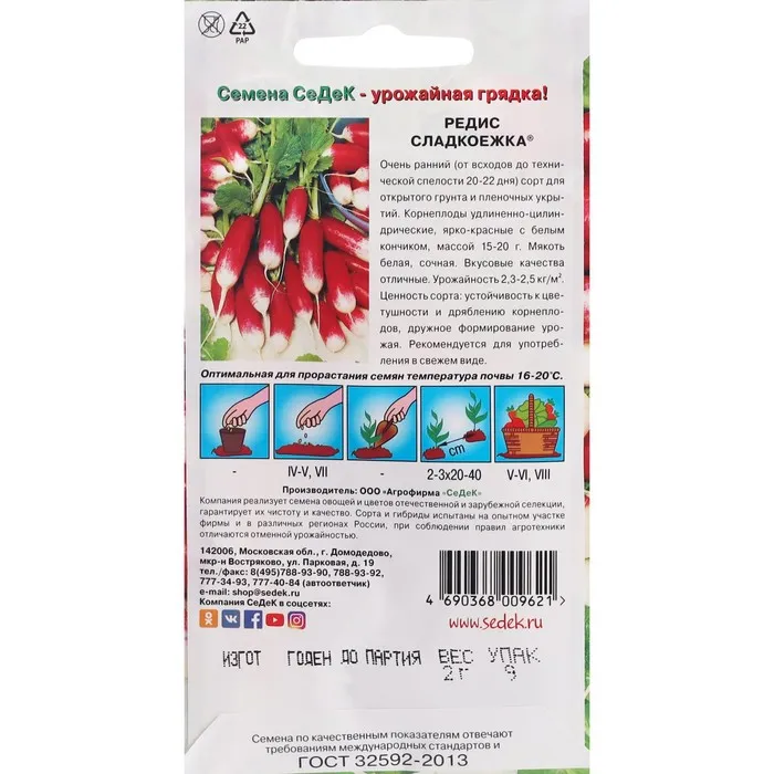 Очень ранний (от всходов до технической спелости 20-22 дня) сорт для открытого грунта и пленочных укрытий. Корнеплоды удлиненно-цилиндрические, ярко-красные с белым кончиком, массой 15-20 г. Мякоть белая, сочная. Вкусовые качества отличные. Урожайность 2,3-2,5 кг/м². Ценность сорта: устойчивость к цветушности и дряблению корнеплодов, дружное формирование урожая. Рекомендуется для употребления в свежем виде. Рекомендуется для выращивания в стеклянных и пленочных теплицах в весенний и осенний периоды, а также в открытом грунте. Устойчив к пустотелости плодов.