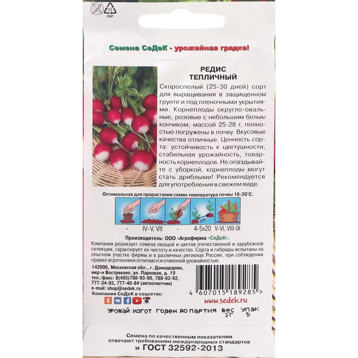 Скороспелый (25-30 дней) сорт для выращивания в защищенном грунте и под пленочными укрытиями. Корнеплоды округло-овальные, розовые с небольшим белым кончиком, массой 25-28 г, полностью погружены в почву. Вкусовые качества отличные. Ценность сорта: устойчивость к цветушности, стабильная урожайность, товарность корнеплодов. Не опаздывайте с уборкой, корнеплоды могут стать дряблыми! Рекомендуется для употребления в свежем виде. Оптимальная для прорастания семян температура почвы 16-20°С.