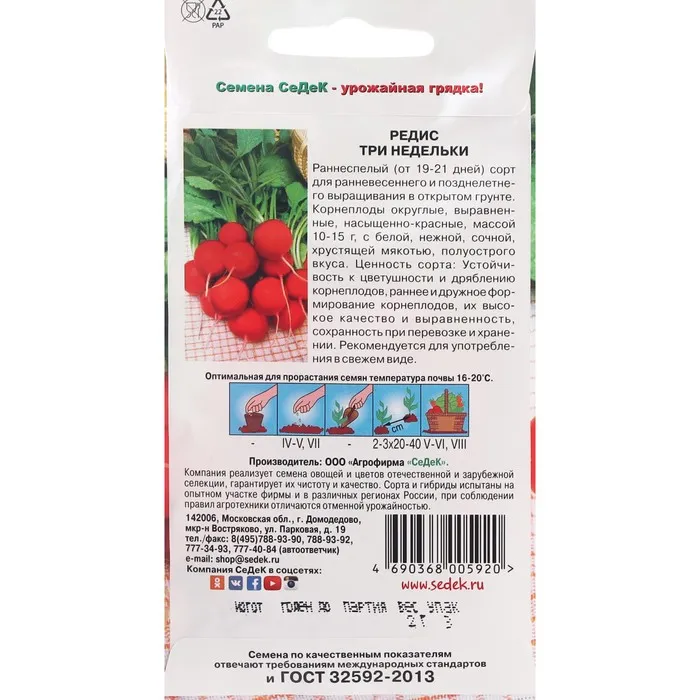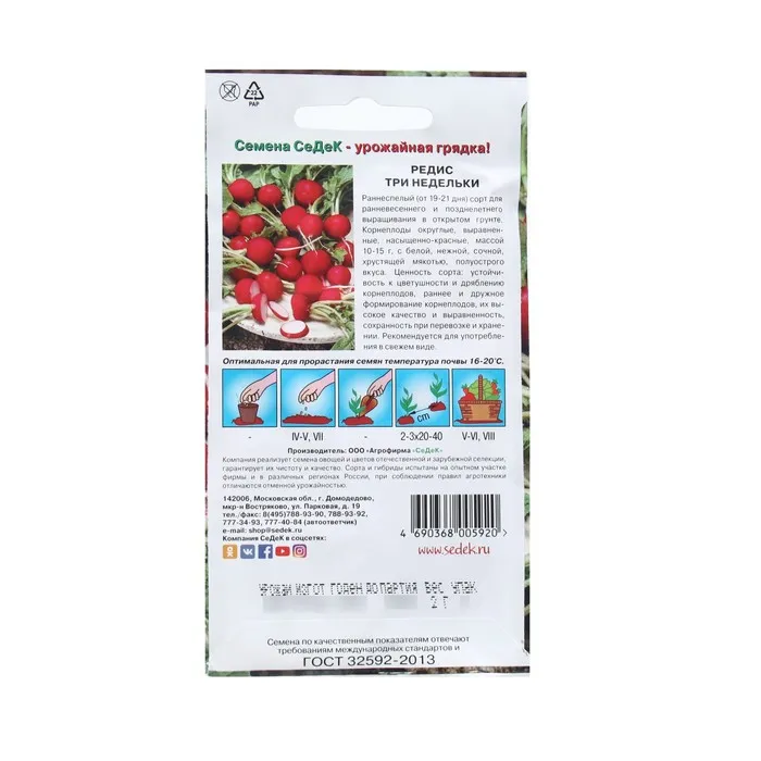 Семена Редис "Три Недельки " 2 г — Характеристики