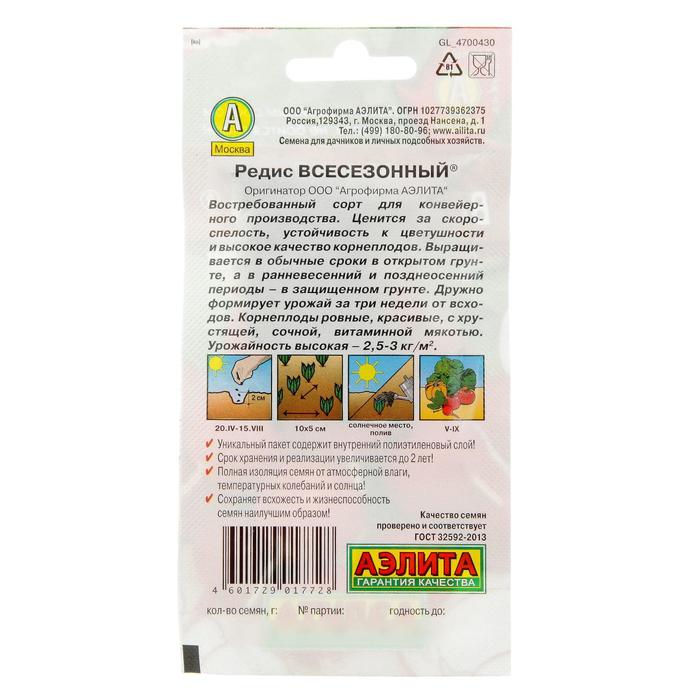 Семена Редис "Всесезонный", 2 гр., — Характеристики