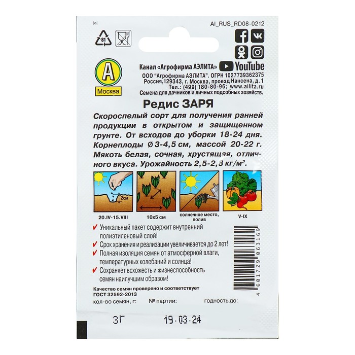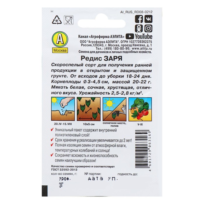 Семена Редис "Заря" "Лидер", 2 г , — Характеристики
