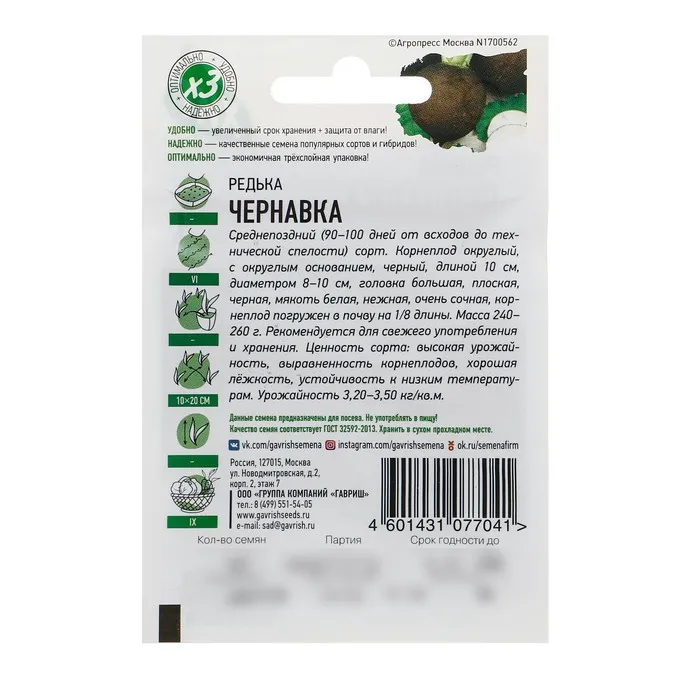 Позднеспелый (90-100 дней от всходов до технической спелости) сорт. Корнеплод округлый, с округлым основанием, черный, длиной 10 см, диаметром 8-10 см, головка большая, плоская, черная, мякоть белая, нежная, очень сочная, корнеплод погружен в почву на 1/8 длины. Масса 240-260 г. Высевают в июле. Урожайность 3,20-3,50 кг/м2. Рекомендуется для свежего потребления и хранения. Ценность сорта: высокая урожайность, выравненность корнеплодов, хорошая лежкость, устойчивость к низким температурам. Схема посадки 10x15 см.