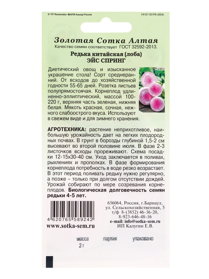 Семена Редька китайская (лоба) «Эйс Спринг», 2 г, среднеранняя, «Золотая Сотка Алтая» — Характеристики