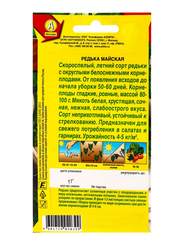 Семена Редька «Майская», 1 г, «Агрофирма АЭЛИТА» — Характеристики