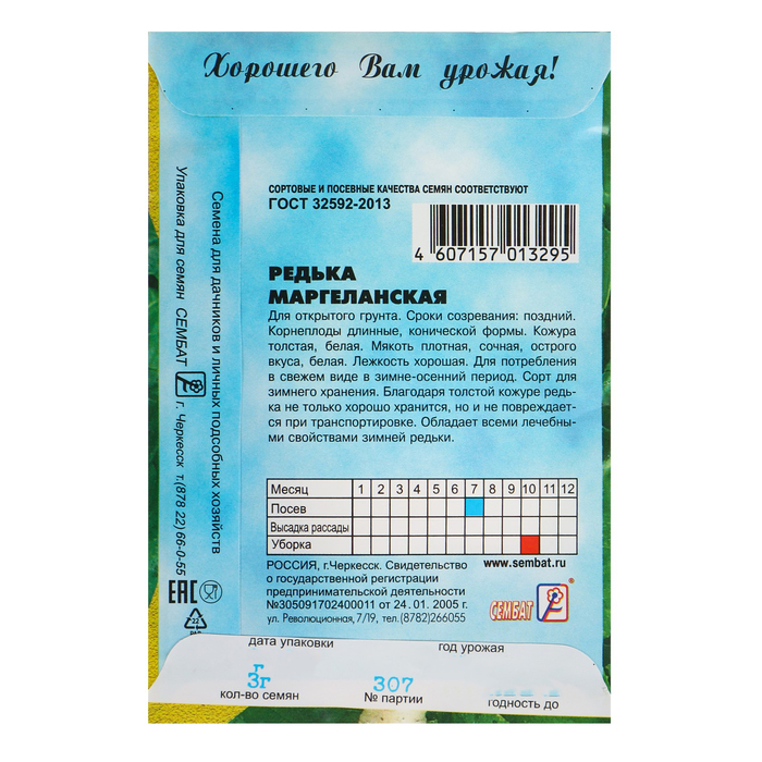 Обычно посев редьки производят в два срока: в самом начале мая и в первых числах июля на глубину 1–2 см на расстоянии 3–5 см. Уже при температуре +2° происходит прорастание всходов. Заморозки до -3°С всходы могут легко выдержать. До -5°С выдерживают заморозки взрослые растения. Температура +18-25°С является оптимальной для роста и развития растений. Основной уход за зеленой редькой заключается в поливах и подкормке. Данный сорт необходимо выкапывать вовремя, поскольку он скороспелый. Зеленая редька станет пустотелой, если она перестоит в земле. В середине июля обычно производят посев редьки данного сорта. Условия хранения редьки ничем не отличаются от условий, в которых хранится свекла и морковь.