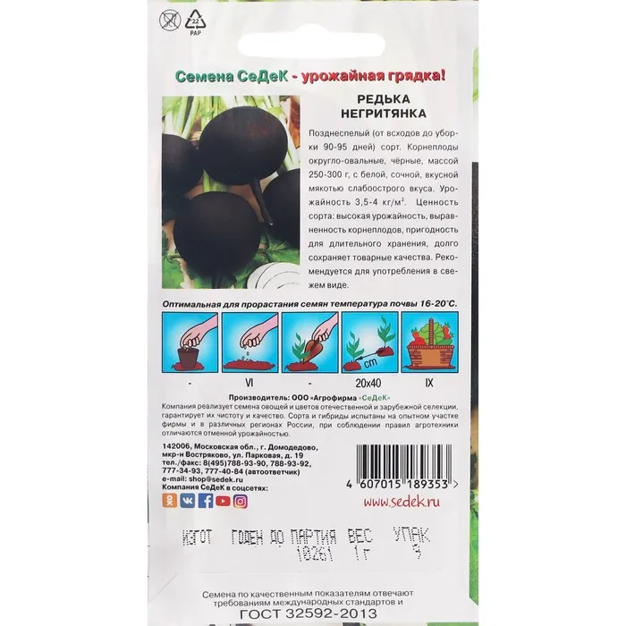 Позднеспелый (от всходов до уборки 90-95 дней) сорт. Корнеплоды округло-овальные, черные, массой 250-300 г, с белой сочной вкусной мякотью слабоострого вкуса.
