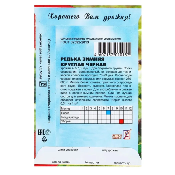 Среднеспелый сорт. Двулетнее лекарственное растение из семейства крестоцветных. Корнеплод формируется в первый год, округлый черного цвета, массой 250 - 500 г, мякоть белая, нежная, очень сочная. В почву погружен полностью. Выдергивается хорошо. Отличается высокой лежкостью в период зимнего хранения.