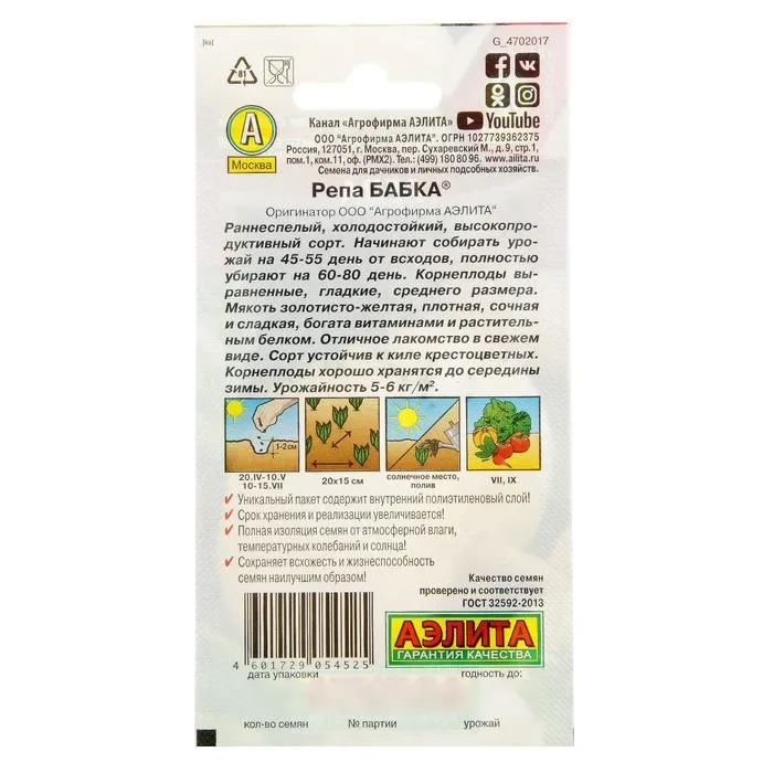 Как сажать. Семена сеют в открытый грунт на глубину 1–2 см. В фазе 1–2 настоящих листьев всходы прореживают. При весеннем посеве корнеплоды убирают выборочно, когда они достигнут в диаметре 5–8 см. Осенью урожай убирают в один приём перед наступлением заморозков.