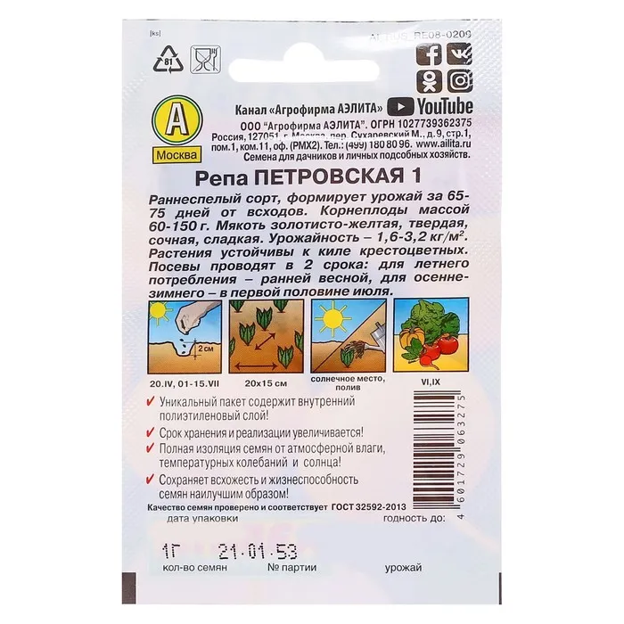Старинный русский сорт репы отличается теневыносливостью, устойчивостью к холоду и распространённой киле. Корнеплоды массой до 150 г созревают за 65–70 дней.