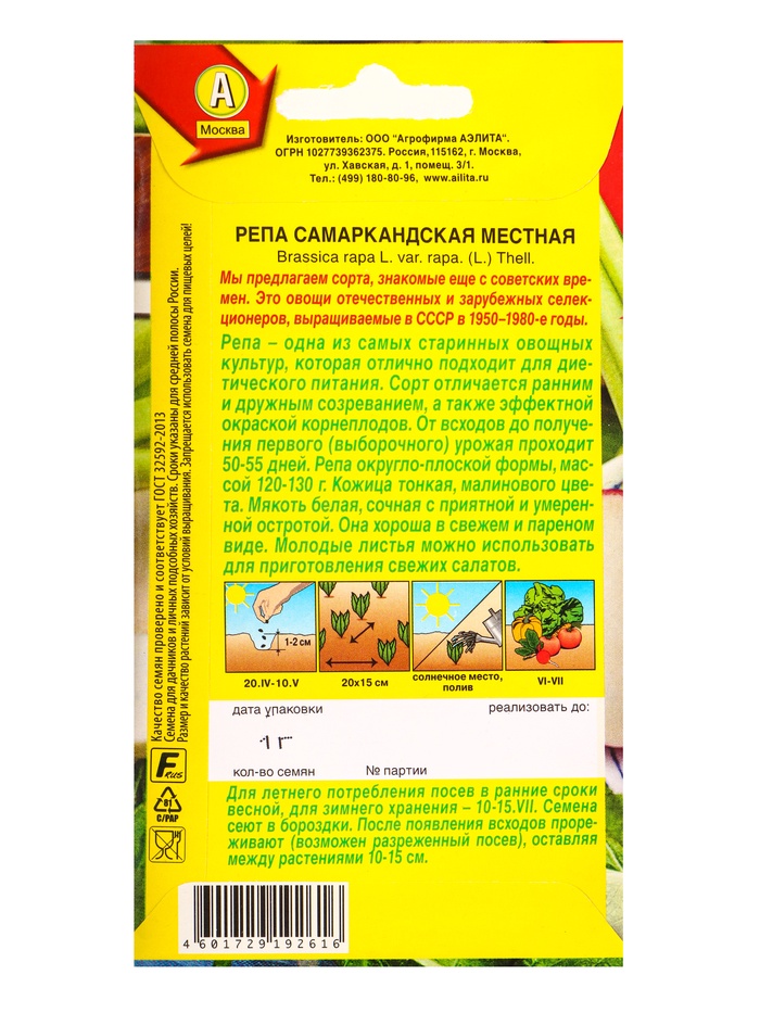 Семена Репа «Самаркандская местная», «Сделано в СССР - Агрофирма АЭЛИТА», 1 г — Характеристики