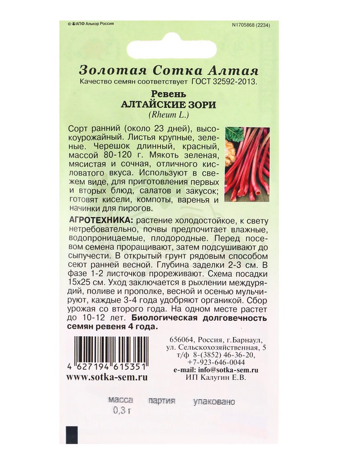 Семена Ревень «Алтайские зори», 0.3 г, ранний, «Золотая Сотка Алтая» — Характеристики