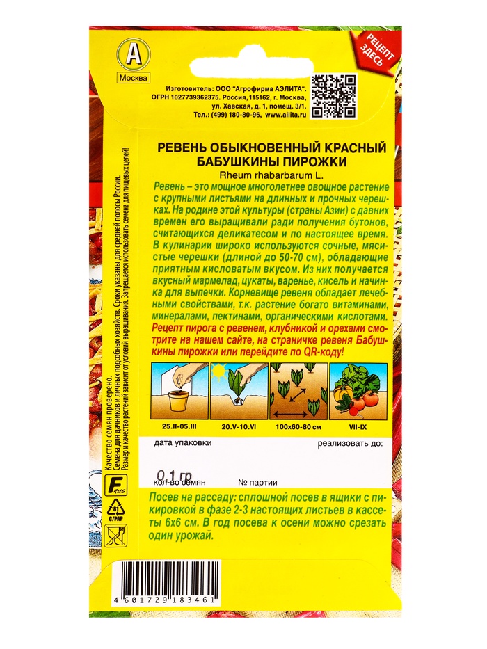 Семена Ревень обыкновенный красный «Бабушкины пирожки», «Блюда стран мира - Агрофирма АЭЛИТА», 0.1 г — Характеристики