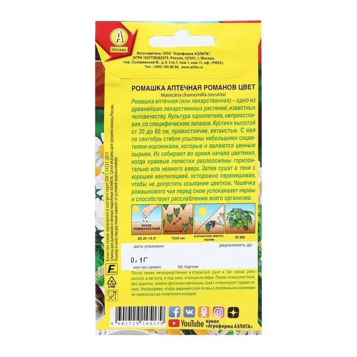 Ромашка аптечная (или лекарственная) – одно из древнейших лекарственных растений известных человечеству. Культура однолетняя, неприхотливая, со специфическим запахом. Кустики высотой от 20 до 60 см, прямостоячие, ветвистые. С мая по сентябрь стебли усыпаны небольшими соцве-тиями-корзинками, которые и являются ценным сырьем. Их собирают во время начала цветения, когда краевые лепестки расположены горизонтально или немного вверх. Затем сушат в тени с хорошей вентиляцией, осторожно перемешивая, чтобы не допустить осыпания цветков. Чашечка ромашкового чая перед сном успокаивает нервы и способствует расслаблению всего организма.