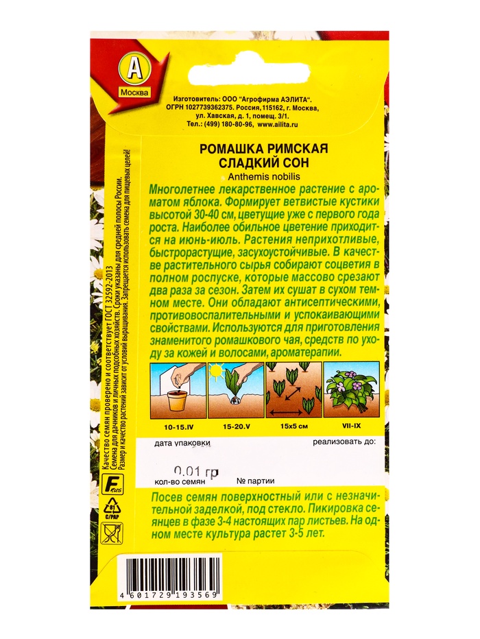 Семена Ромашка римская «Сладкий сон», «Лечебный огород - АЭЛИТА», 0.01 г — Характеристики