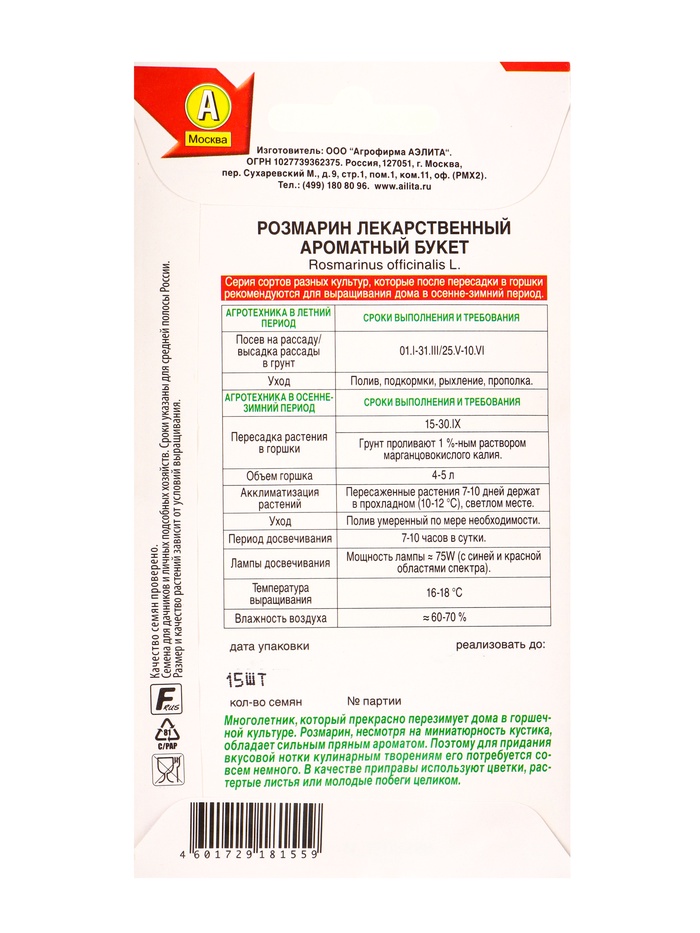 Семена Розмарин Ароматный букет Лето продолжается., Ц/П,15 шт. — Характеристики