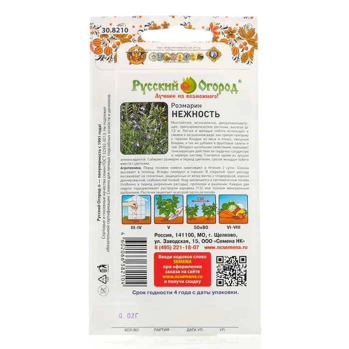 Многолетнее, вечнозеленое, декоративно-цветущее, пряно-ароматическое растение, высотой до 1,0 м. Листья и молодые побеги розмарина используют в свежем и засушенном виде: как пряную приправу к горячим блюдам из мяса и птицы, овощным блюдам из фасоли, гороха, баклажан, капусты, а так же добавка в фруктовые салаты и чай. Обладает целебными свойствами, оказывает тонизирующее действие на сердечно-сосудистую и нервную систему. Считается одним из лучших антиоксидантов. Собирают розмарин в период цветения, срезая молодые побеги вместе с цветками.